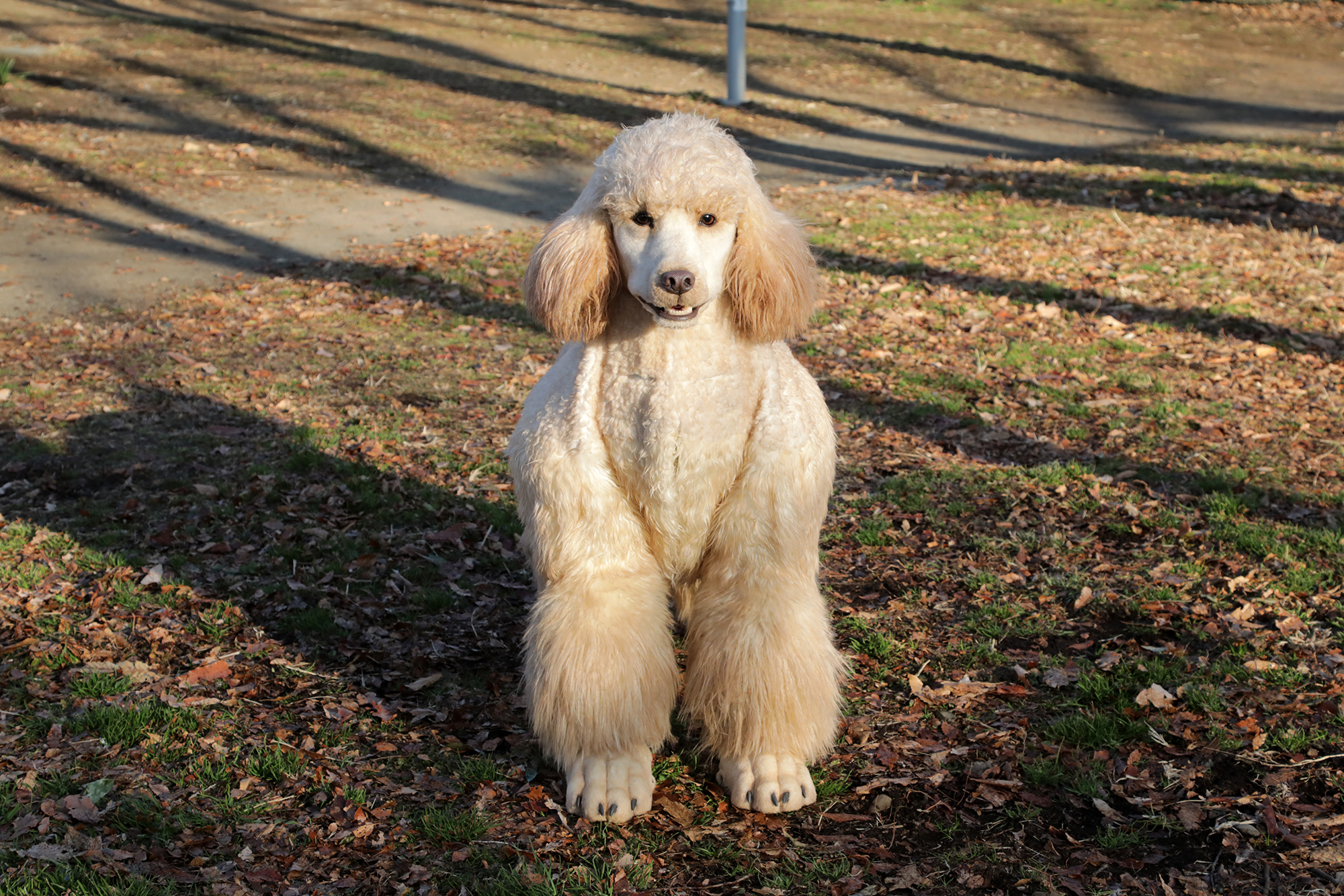 We received a request from an individual to create a dog costume. This costume is modeled after a standard poodle, realistically replicating the appearance of a dog walking on all fours, just like a real one.